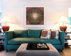 Если вы хотите, чтобы диван выделялся на фоне остального декора комнаты, но при этом вы все еще хотите, чтобы он хоть как-то сочетался с ним, можно выбрать цвет, который дополняет оттенки акцента, использованного в комнате. Например, зеленый диван. Рядом с ним стоят две красные лампы, а картина с красным фоном размещена прямо над ним.