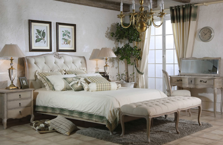 Традиционная мебель в стиле прованс отличается достаточно крупными размерами, массивными формами и особым дизайном в старинном стиле. Дверцы гардероба и ножки кровати украшены выразительной резьбой, поверхности могут быть окрашены, либо намеренно обработаны под состаренное дерево. В стиле прованс нет резких контрастов линий и форм, силуэт одного предмета гармонично перетекает в контуры другого. Полировка, блеск и глянец убивает естественность и простоту прованского стиля, только матовые поверхности, нарочитый эффект винтажа и стильное ретро. Фамильные фотографии на стенах, комоде или прикроватной тумбочке прекрасно вписываются в уют прованской спальни.